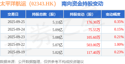 证券之星消息,9月25日南向资金增持176.3万股太平洋航运(02343.HK)。近5个交易日中,获南向资金增持的有5天,累计净增持977.85万股。近20个交易日中,获南向资金增持的有15天,累计净增持2944.85万股。截至目前,南向资金持有太平洋航运(02343.HK)5.11亿股,占公司已发行普通股的9.76%。