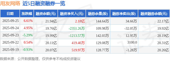 用友网络融资融券信息显示,融资方面,当日融资买入5.94亿元,融资偿还3.76亿元,融资净买入2.18亿元,净买入额两市排名第9。融券方面,融券卖出38.82万股,融券偿还4.16万股,融券余量144.64万股,融券余额2286.7万元。融资融券余额22.17亿元。