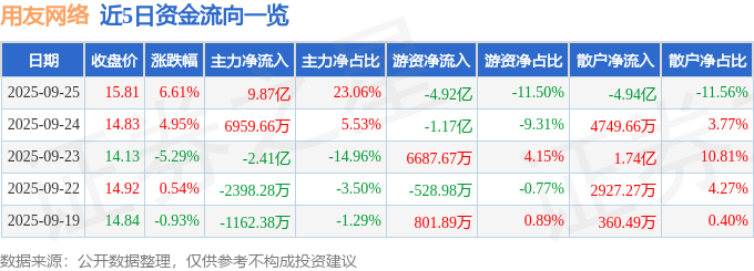 证券之星消息,截至2025年9月25日收盘,用友网络(600588)报收于15.81元,上涨6.61%,换手率7.83%,成交量267.7万手,成交额42.79亿元。