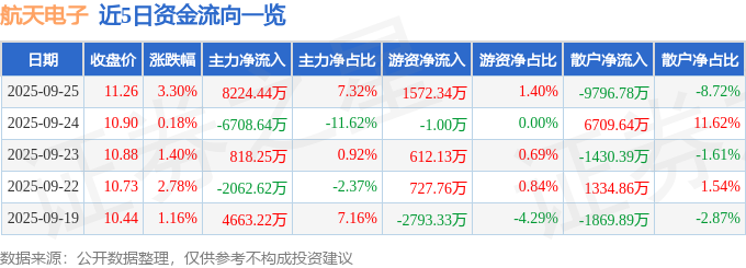 证券之星消息,截至2025年9月25日收盘,航天电子(600879)报收于11.26元,上涨3.3%,换手率3.05%,成交量100.72万手,成交额11.23亿元。