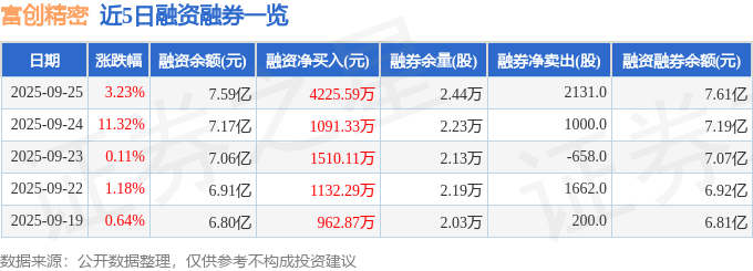 富创精密融资融券信息显示,融资方面,当日融资买入1.8亿元,融资偿还1.38亿元,融资净买入4225.59万元,连续3日净买入累计6827.04万元。融券方面,融券卖出5593.0股,融券偿还3462.0股,融券余量2.44万股,融券余额182.3万元。融资融券余额7.61亿元。