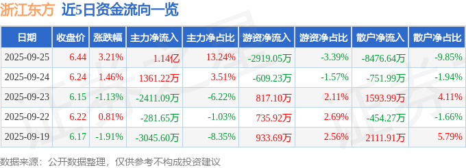证券之星消息,截至2025年9月25日收盘,浙江东方(600120)报收于6.44元,上涨3.21%,换手率3.97%,成交量135.57万手,成交额8.61亿元。