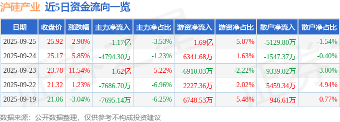 证券之星消息,截至2025年9月25日收盘,沪硅产业(688126)报收于25.92元,上涨2.98%,换手率4.77%,成交量130.23万手,成交额33.3亿元。
