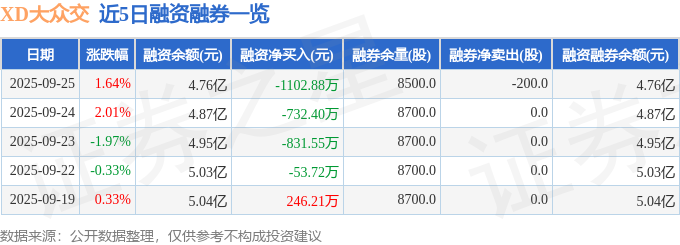 XD大众交融资融券信息显示,融资方面,当日融资买入1968.34万元,融资偿还3071.21万元,融资净偿还1102.88万元。融券方面,融券卖出0.0股,融券偿还200.0股,融券余量8500.0股,融券余额5.25万元。融资融券余额4.76亿元。