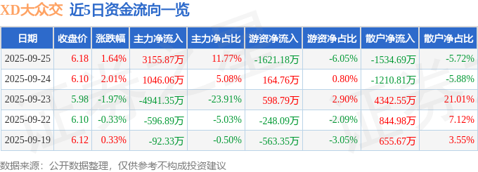 证券之星消息,截至2025年9月25日收盘,XD大众交(600611)报收于6.18元,上涨1.64%,换手率2.82%,成交量44.11万手,成交额2.68亿元。