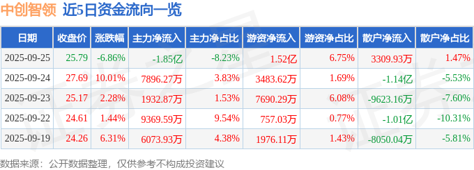 证券之星消息,截至2025年9月25日收盘,中创智领(601717)报收于25.79元,下跌6.86%,换手率5.53%,成交量85.25万手,成交额22.45亿元。