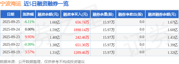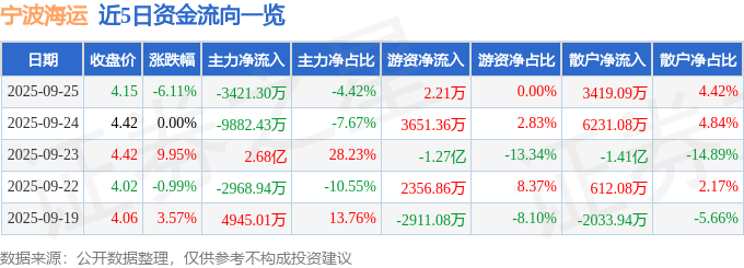 证券之星消息,截至2025年9月25日收盘,宁波海运(600798)报收于4.15元,下跌6.11%,换手率15.27%,成交量184.2万手,成交额7.73亿元。