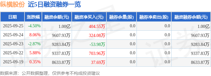 纵横股份融资融券信息显示,融资方面,当日融资买入1845.6万元,融资偿还1441.05万元,融资净买入404.55万元。融券方面,融券卖出0.0股,融券偿还0.0股,融券余量0.0股,融券余额0.0万元。融资融券余额1.0亿元。