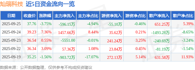 证券之星消息,截至2025年9月25日收盘,灿瑞科技(688061)报收于37.76元,下跌3.75%,换手率7.3%,成交量3.16万手,成交额1.21亿元。