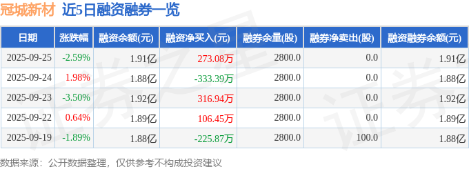 冠城新材融资融券信息显示,融资方面,当日融资买入795.11万元,融资偿还522.03万元,融资净买入273.08万元。融券方面,融券卖出0.0股,融券偿还0.0股,融券余量2800.0股,融券余额0.84万元。融资融券余额1.91亿元。