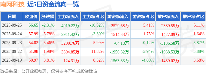 证券之星消息,截至2025年9月25日收盘,南网科技(688248)报收于56.65元,下跌2.31%,换手率3.58%,成交量8.18万手,成交额4.68亿元。