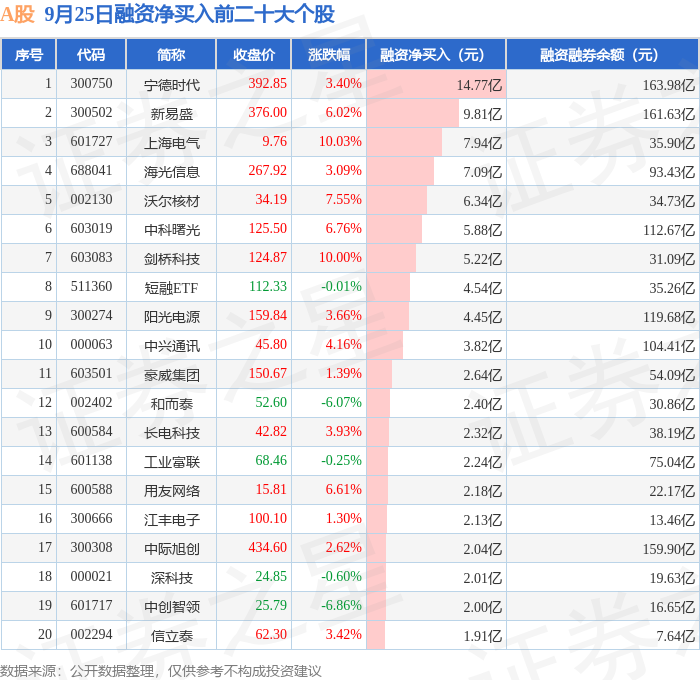 A股融资净买入前三分别为:宁德时代(300750)融资净买入14.77亿元、新易盛(300502)融资净买入9.81亿元、上海电气(601727)融资净买入7.94亿元,前20具体见下表:
