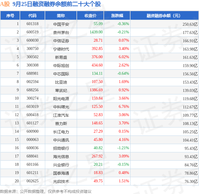 A股融资融券余额前三分别为:中国平安(601318)融资融券余额250.63亿元、贵州茅台(600519)融资融券余额177.63亿元、中信证券(600030)融资融券余额166.91亿元,前20具体见下表: