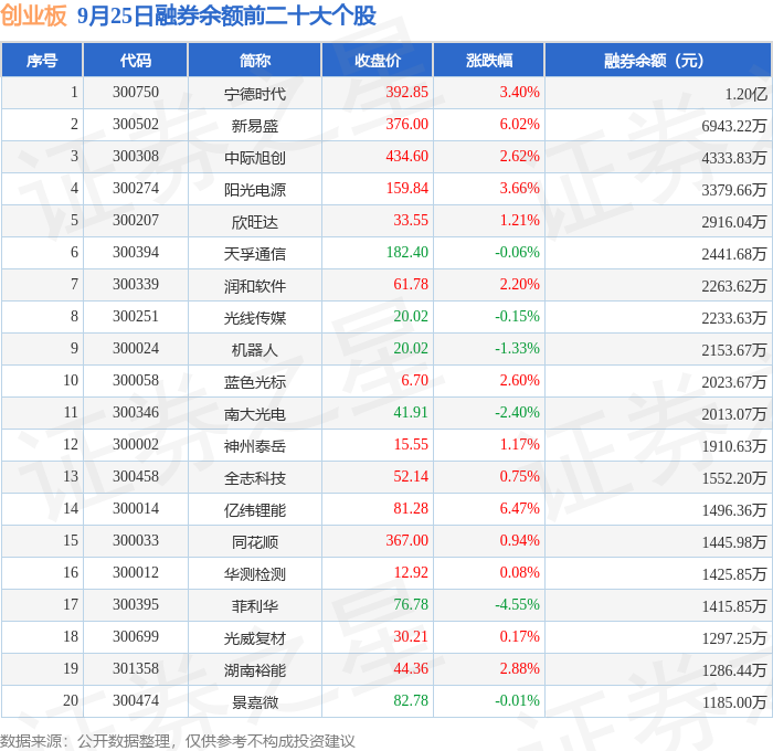 创业板融券余额前三分别为:宁德时代(300750)融券余额1.2亿元、新易盛(300502)融券余额6943.22万元、中际旭创(300308)融券余额4333.83万元,前20具体见下表: