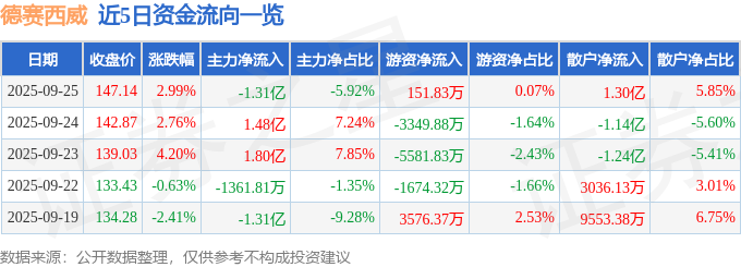 证券之星消息,截至2025年9月25日收盘,德赛西威(002920)报收于147.14元,上涨2.99%,换手率2.68%,成交量14.81万手,成交额22.19亿元。