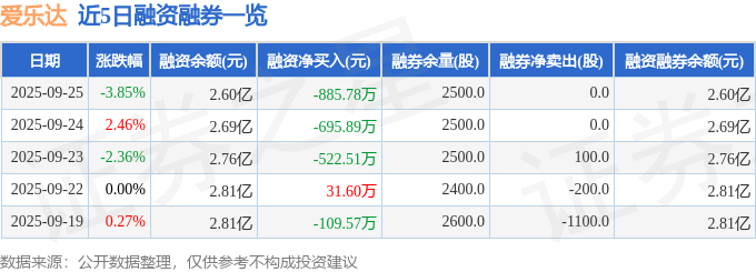 爱乐达融资融券信息显示,融资方面,当日融资买入1842.02万元,融资偿还2727.8万元,融资净偿还885.78万元。融券方面,融券卖出0.0股,融券偿还0.0股,融券余量2500.0股,融券余额6.31万元。融资融券余额2.6亿元。