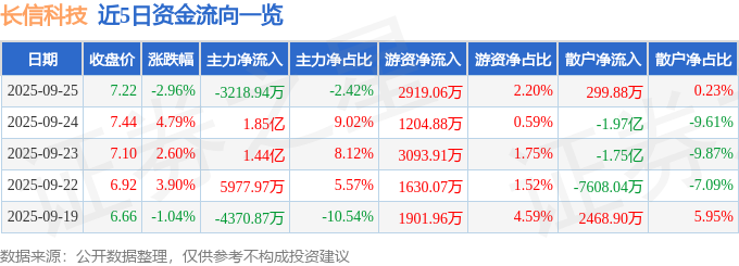 证券之星消息,截至2025年9月25日收盘,长信科技(300088)报收于7.22元,下跌2.96%,换手率7.35%,成交量182.6万手,成交额13.28亿元。