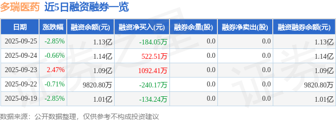 多瑞医药融资融券信息显示,融资方面,当日融资买入267.94万元,融资偿还451.99万元,融资净偿还184.05万元。融券方面,融券卖出0.0股,融券偿还0.0股,融券余量0.0股,融券余额0.0万元。融资融券余额1.13亿元。