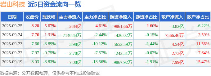证券之星消息,截至2025年9月25日收盘,岩山科技(002195)报收于8.2元,上涨5.67%,换手率13.52%,成交量757.1万手,成交额61.49亿元。