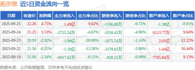 证券之星消息,截至2025年9月25日收盘,拓尔思(300229)报收于22.26元,上涨4.75%,换手率7.98%,成交量69.67万手,成交额15.46亿元。