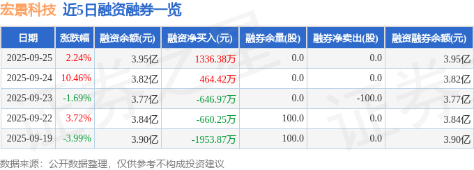 宏景科技融资融券信息显示,融资方面,当日融资买入2.0亿元,融资偿还1.87亿元,融资净买入1336.38万元。融券方面,融券卖出0.0股,融券偿还0.0股,融券余量0.0股,融券余额0.0万元。融资融券余额3.95亿元。