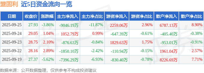 证券之星消息,截至2025年9月25日收盘,盟固利(301487)报收于27.93元,下跌3.86%,换手率9.78%,成交量26.68万手,成交额7.62亿元。
