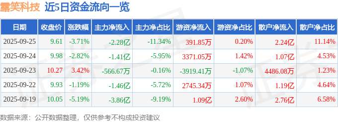 9月25日的资金流向数据方面,主力资金净流出2.28亿元,占总成交额11.34%,游资资金净流入391.85万元,占总成交额0.2%,散户资金净流入2.24亿元,占总成交额11.14%。