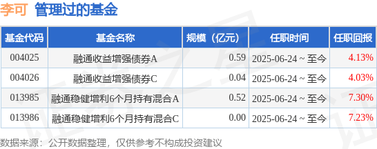 李可先生:中国国籍,清华大学硕士。2015年7月至2017年4月在上海银行股份有限公司工作,担任总行管理培训生;2017年4月至2020年9月在中信银行股份有限公司工作,担任投资经理;2020年9月至2022年7月在信银理财有限责任公司工作,担任投资经理;2022年7月至2024年11月在申万宏源证券有限公司资产管理事业部(现为申万宏源证券资产管理有限公司)工作,担任投资经理。2024年11月加入融通基金管理有限公司。2025年6月24日担任融通收益增强债券型证券投资基金基金经理、融通稳健增利6个月持有期混合型证券投资基金基金经理、融通稳健增利6个月持有期混合型证券投资基金基金经理。