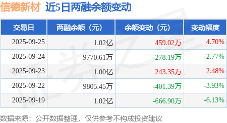 证券之星消息,9月25日,信德新材(301349)融资买入1240.28万元,融资偿还781.26万元,融资净买入459.02万元,融资余额1.02亿元。