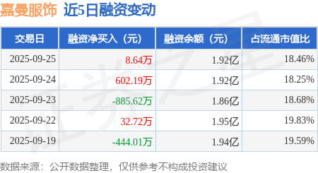 证券之星消息,9月25日,嘉曼服饰(301276)融资买入5026.39万元,融资偿还5017.75万元,融资净买入8.64万元,融资余额1.92亿元,近20个交易日中有13个交易日出现融资净买入。