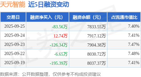 证券之星消息,9月25日,天元智能(603273)融资买入287.6万元,融资偿还371.16万元,融资净卖出83.56万元,融资余额7833.55万元。