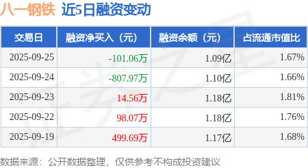 证券之星消息,9月25日,八一钢铁(600581)融资买入570.63万元,融资偿还671.7万元,融资净卖出101.06万元,融资余额1.09亿元。