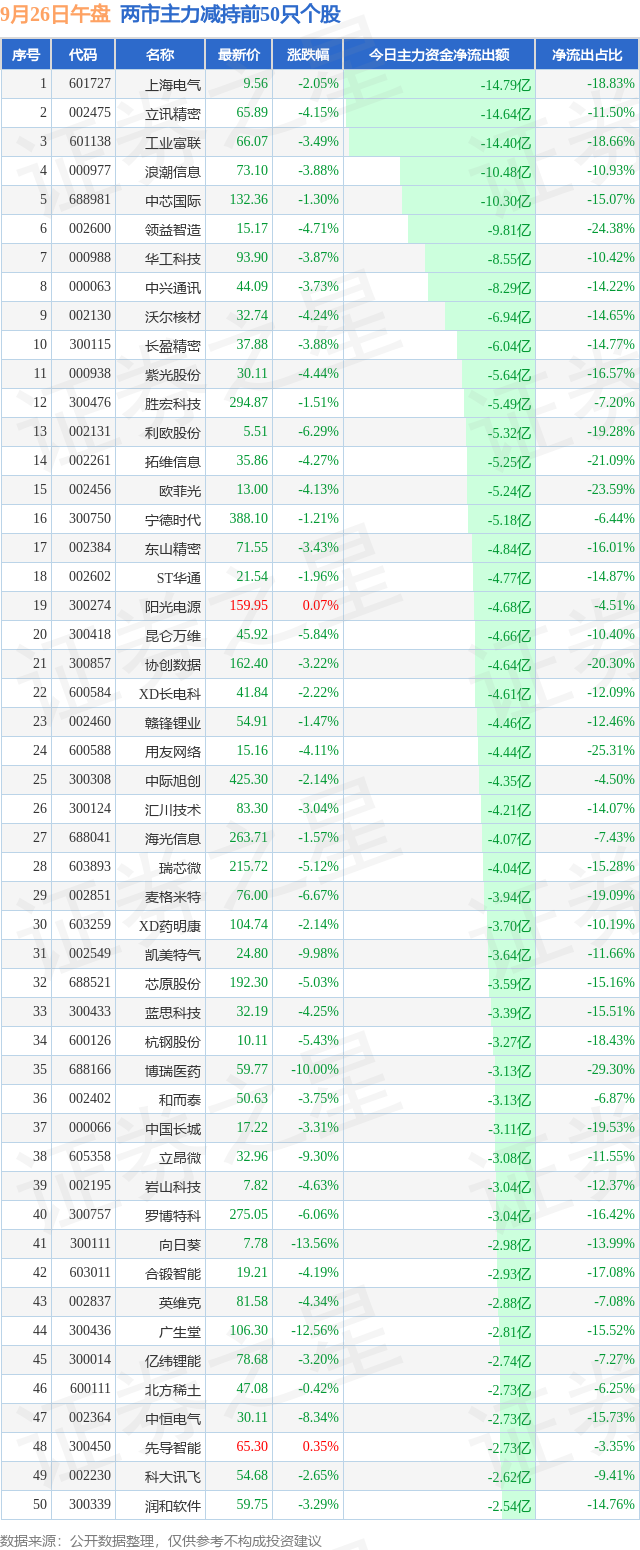 两市主力减持最多的前十只个股为: