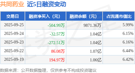 证券之星消息,9月25日,共同药业(300966)融资买入368.51万元,融资偿还873.5万元,融资净卖出504.99万元,融资余额9871.36万元。