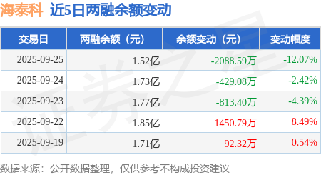 证券之星消息,9月25日,海泰科(301022)融资买入2129.58万元,融资偿还4218.16万元,融资净卖出2088.59万元,融资余额1.52亿元。