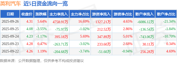 证券之星消息,截至2025年9月26日收盘,英利汽车(601279)报收于4.31元,上涨5.64%,换手率4.16%,成交量65.97万手,成交额2.85亿元。