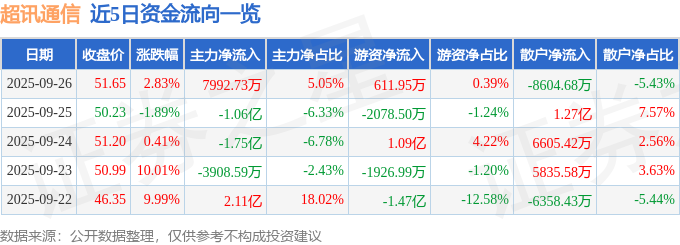 证券之星消息,截至2025年9月26日收盘,超讯通信(603322)报收于51.65元,上涨2.83%,换手率19.58%,成交量30.86万手,成交额15.84亿元。