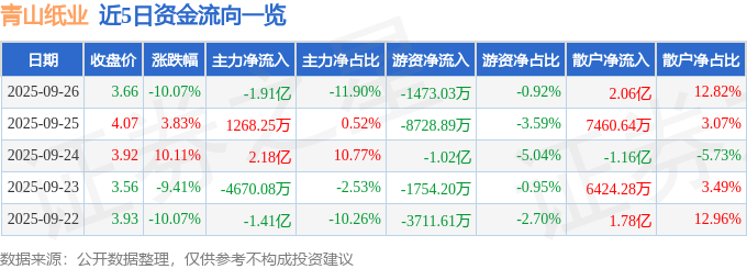 证券之星消息,截至2025年9月26日收盘,青山纸业(600103)报收于3.66元,下跌10.07%,跌停,换手率19.12%,成交量422.99万手,成交额16.06亿元。