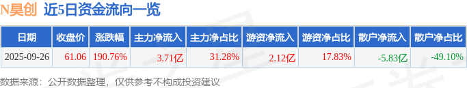 证券之星消息,截至2025年9月26日收盘,N昊创(301668)报收于61.06元,上涨190.76%,换手率81.6%,成交量18.81万手,成交额11.88亿元。
