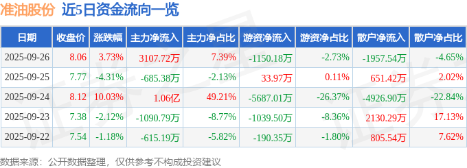 证券之星消息,截至2025年9月26日收盘,准油股份(002207)报收于8.06元,上涨3.73%,换手率20.0%,成交量52.16万手,成交额4.21亿元。