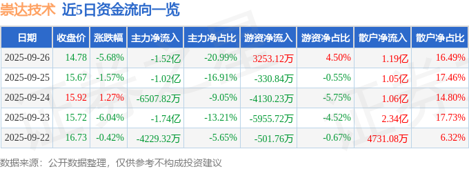 证券之星消息,截至2025年9月26日收盘,崇达技术(002815)报收于14.78元,下跌5.68%,换手率6.16%,成交量47.86万手,成交额7.23亿元。