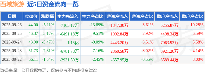 证券之星消息,截至2025年9月26日收盘,西域旅游(300859)报收于44.0元,下跌5.11%,换手率7.32%,成交量11.34万手,成交额5.11亿元。