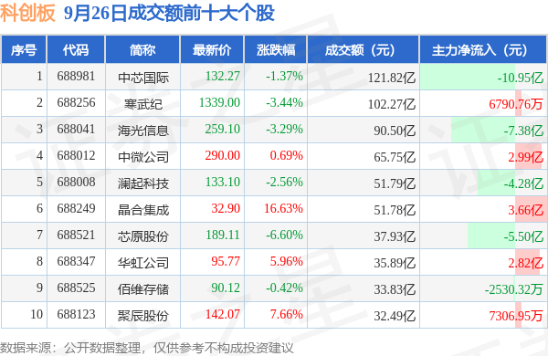 当日科创板成交额前10大个股中4只个股收涨,平均涨幅7.74%,其中中芯国际(688981)以成交额121.82亿元排第一。从主力资金流入看,成交额前10大个股中有5只个股呈现主力资金净流入。