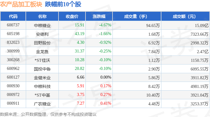 证券之星消息,9月26日农产品加工板块较上一交易日下跌0.75%,中粮糖业领跌。当日上证指数报收于3828.11,下跌0.65%。深证成指报收于13209.0,下跌1.76%。农产品加工板块个股涨跌见下表: