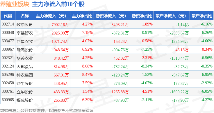 从资金流向上来看,当日养殖业板块主力资金净流入1071.48万元,游资资金净流入1.81亿元,散户资金净流出1.92亿元。养殖业板块个股资金流向见下表: