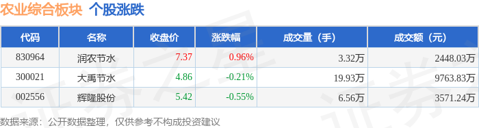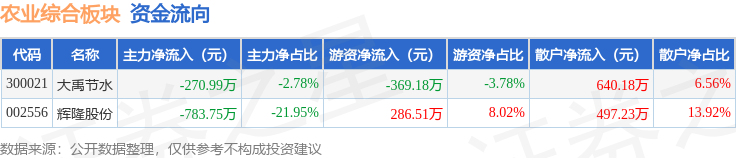 从资金流向上来看,当日农业综合板块主力资金净流出1054.74万元,游资资金净流出82.67万元,散户资金净流入1137.41万元。农业综合板块个股资金流向见下表: