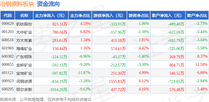 从资金流向上来看,当日冶钢原料板块主力资金净流出1227.45万元,游资资金净流入2480.93万元,散户资金净流出1253.48万元。冶钢原料板块个股资金流向见下表: