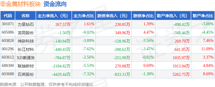 从资金流向上来看,当日非金属材料板块主力资金净流出7714.33万元,游资资金净流出562.29万元,散户资金净流入8276.62万元。非金属材料板块个股资金流向见下表: