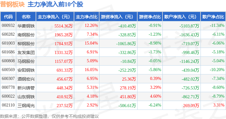 从资金流向上来看,当日普钢板块主力资金净流出4.43亿元,游资资金净流入1.75亿元,散户资金净流入2.68亿元。普钢板块个股资金流向见下表: