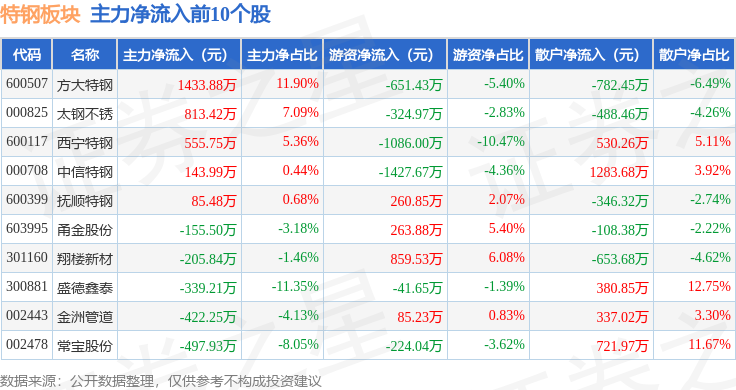 从资金流向上来看,当日特钢板块主力资金净流出4864.27万元,游资资金净流出2060.73万元,散户资金净流入6925.0万元。特钢板块个股资金流向见下表: